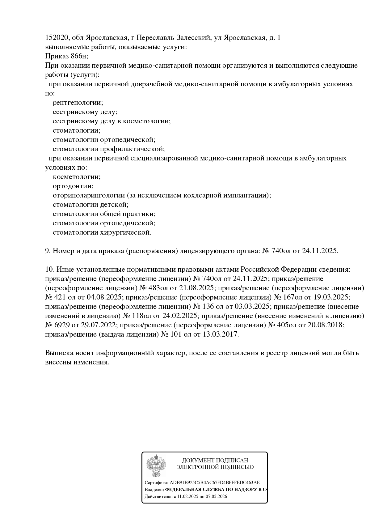 Медицинские услуги по профилям деятельности ООО «Семейный доктор» по территориальному принципу могут быть оказаны по адресам медицинских организаций государственной системы здравоохранения: ГБУЗ ЯО «Переславская центральная районной больница», стоматология, crb-pereslavl.ru.
